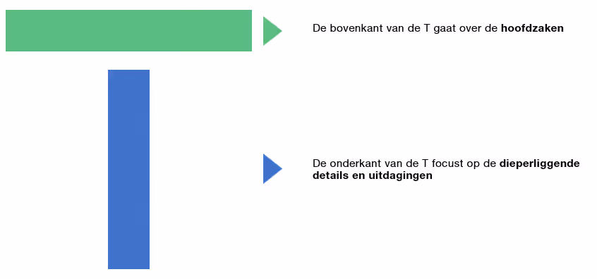De onderkant van de T (de verticale balk van de T) focust op de dieperliggende details en uitdagingen.